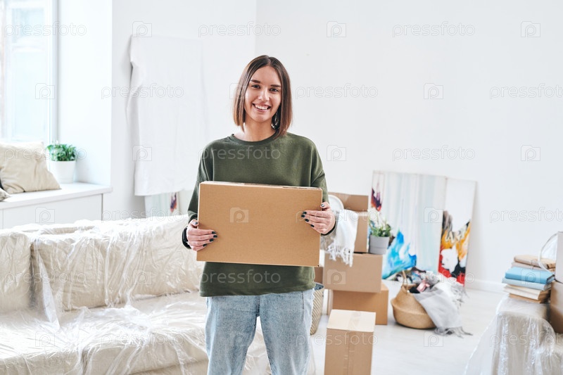 Молодая улыбающаяся женщина держит картонную коробку, стоя в гостиной