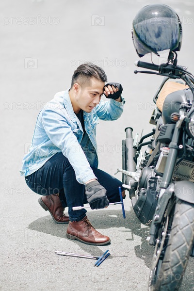 Сбитый с толку мужчина ремонтирует мотоцикл