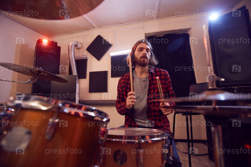 Современный бородатый мужчина играет на барабанах
