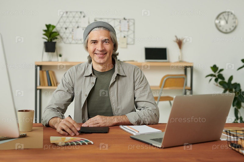 Портрет улыбающегося опытного зрелого дизайнера в хипстерской шляпе, сидящего за столом с ноутбуком и цифровизатором в домашнем офисе