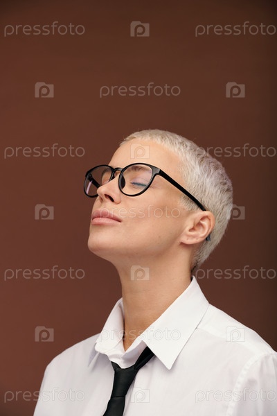 Современная молодая спокойная женщина в очках, белой рубашке и черном галстуке