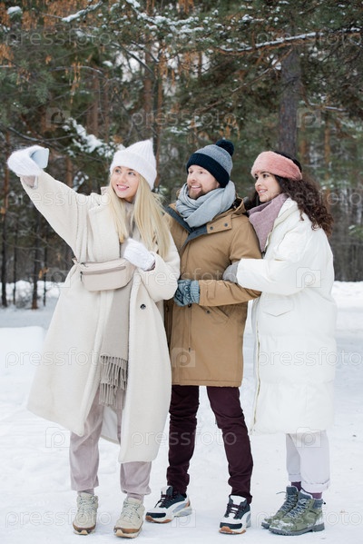 Счастливые молодые друзья, делающие селфи
