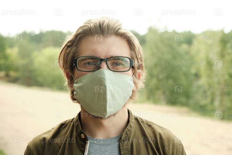 Парень в защитной ручной маске и очках стоит перед камерой