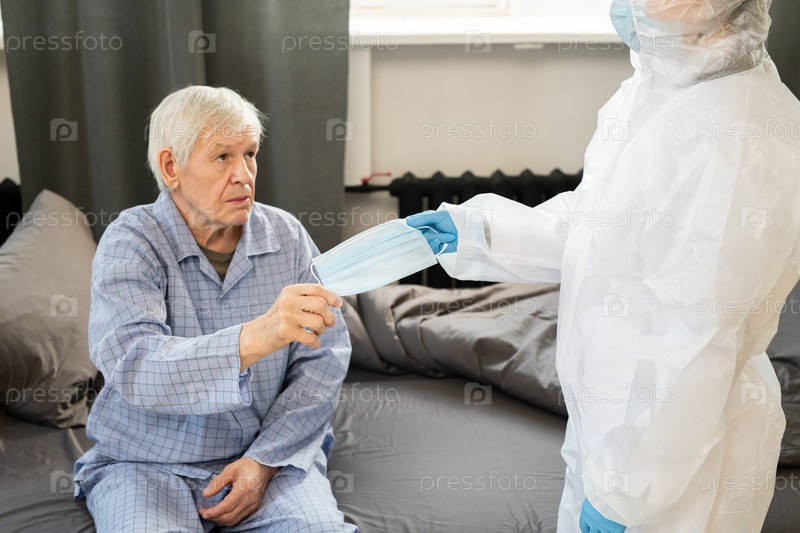 Больной пожилой человек в синей пижаме забирает медицинскую маску из перчаточной руки врача