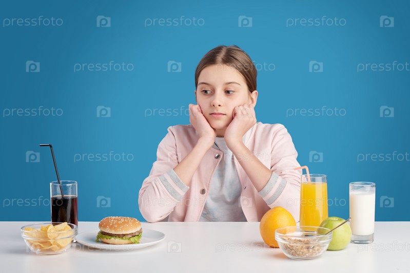 Девушка-подросток выбирает между свежим органическим здоровым питанием и нездоровой пищей