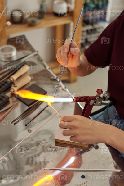 Девушка-ремесленница, сидящая на рабочем месте и сжигающая изделия в форме палочки с огнем