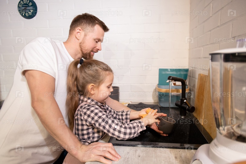 Милая девочка стирает чашку над раковиной с помощью пылесоса и посудомоечной машины