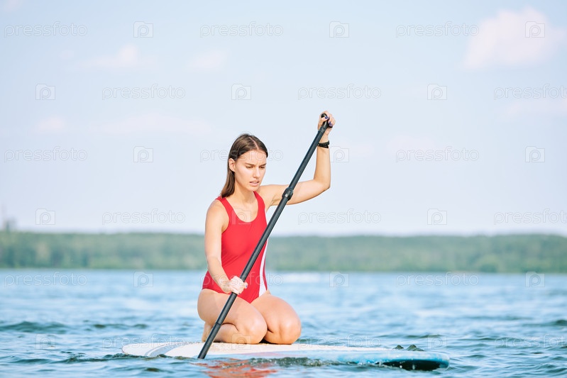 Молодая брюнетка-спортсменка в красном купальном костюме плавает на доске для серфинга на курорте