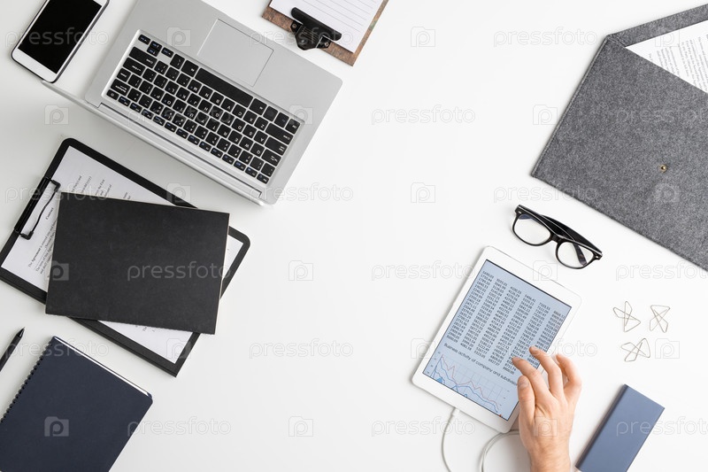 Игра рук современного экономиста, использующего планшет при анализе данных
