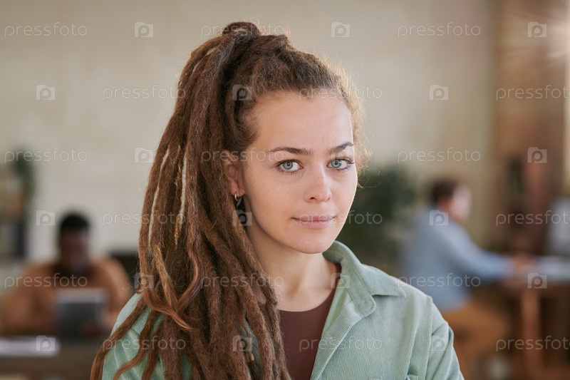 Портрет серьезной уверенной в себе молодой женщины с дредольками, работающей в современном офисе