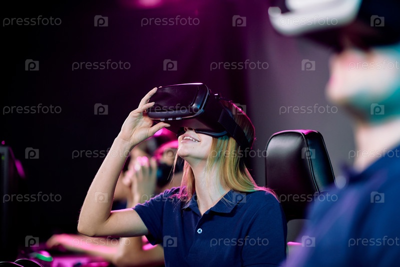 Счастливая молодая видеоигрок-женщина в VR гарнитуре сидит среди своих друзей