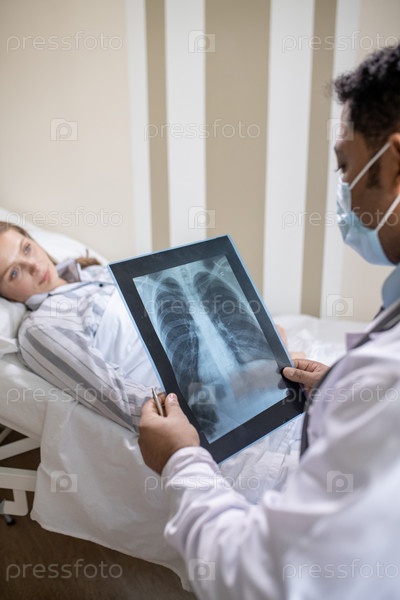 Радиолог-мужчина смотрит на рентгеновское изображение легких больной пациентки с коронавирусом