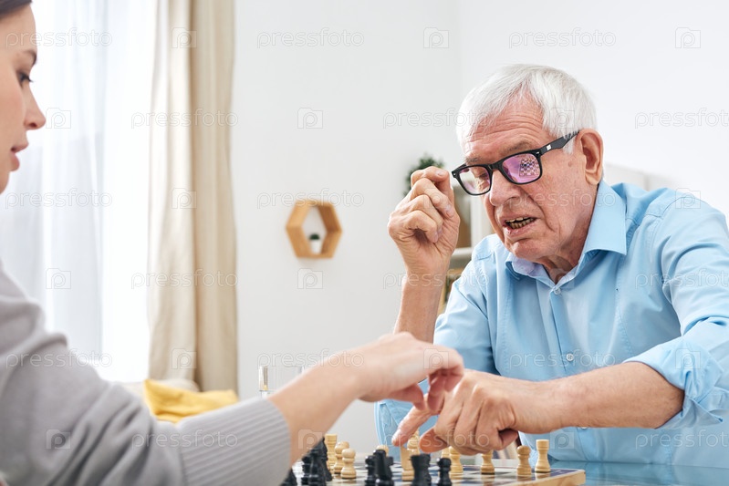Пожилой инвалид в очках и рубашке играет в шахматы с социальным работником