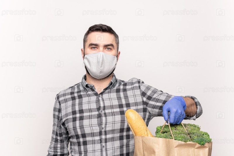 Молодой человек в защитной маске и перчатках держит бумажный пакет с продуктами питания