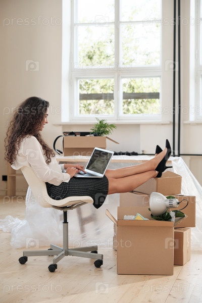 Позитивная молодая бизнес-леди в юбке, сидящая ногами на куче коробки для переездов и работающая с ноутбуком в новом офисе