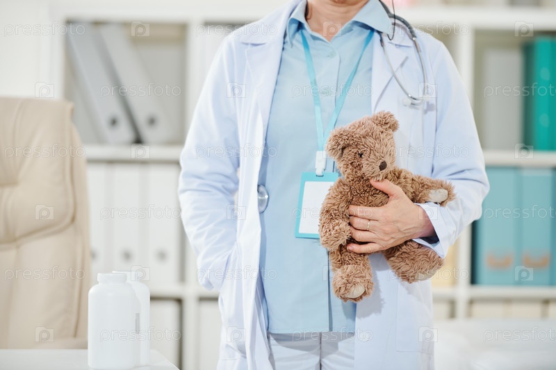 Педиатр держит плюшевого медведя