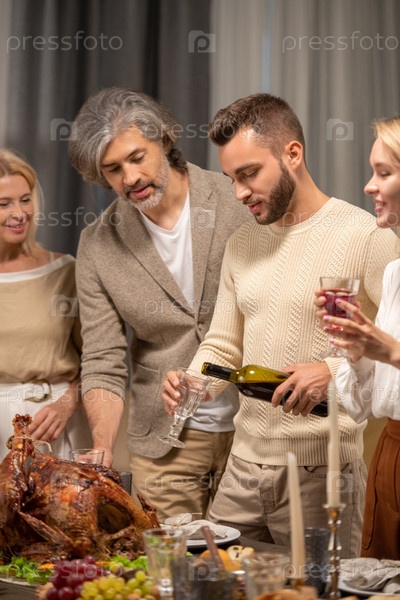 Зрелая пара смотрит на молодого человека, который наливает красное вино в бокал у стола