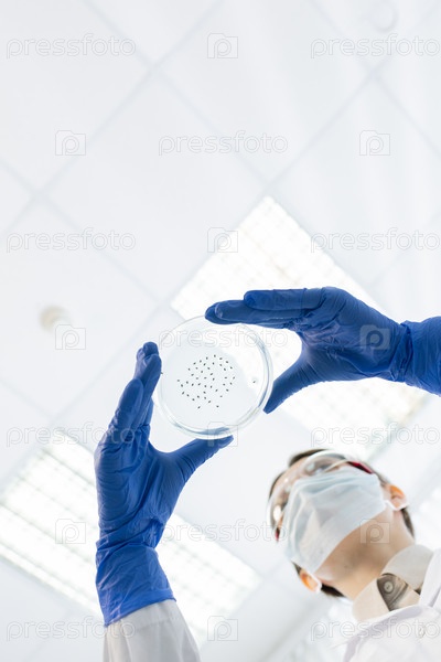 Перчаточные руки молодого химика или фармацевта, держащего чашу Петри с бактериями