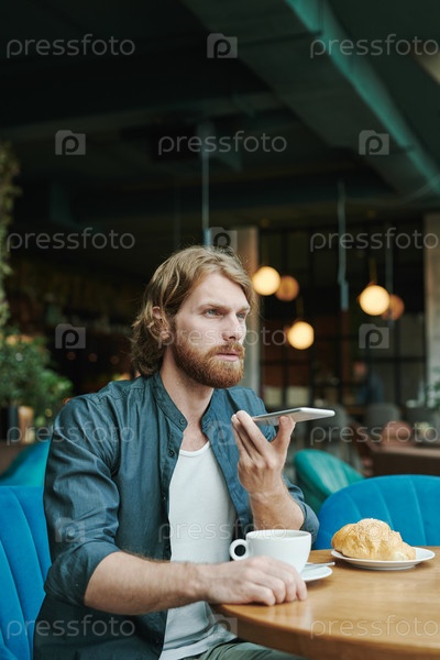 Молодой бородатый менеджер сидит за столом с чашечкой кофе и кроасаном и записывает голосовое сообщение для коллеги, используя смартфон в кафе