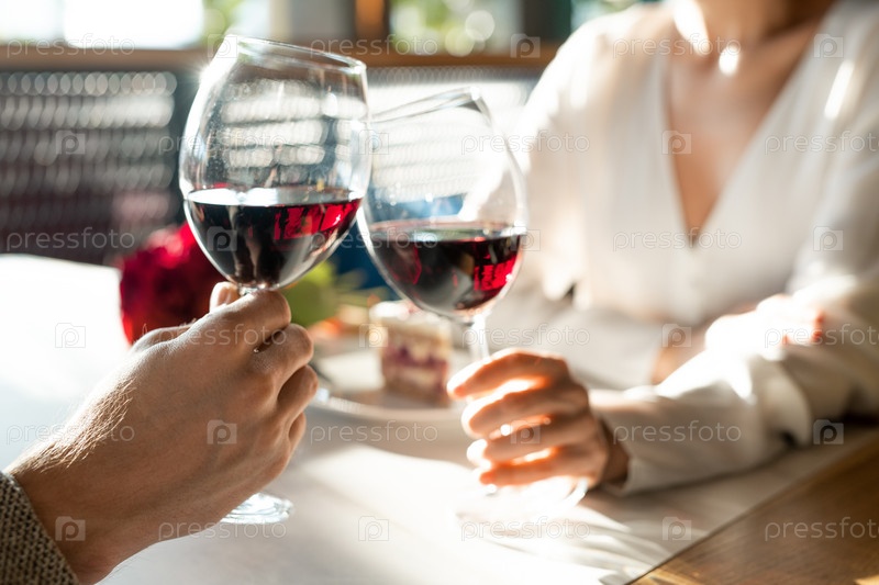 Руки молодого человека и его девушки, сверкающие со стаканами вина над столом