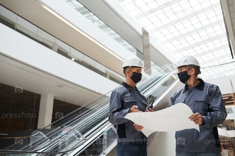 Строительные рабочие, носящие маски на стройке