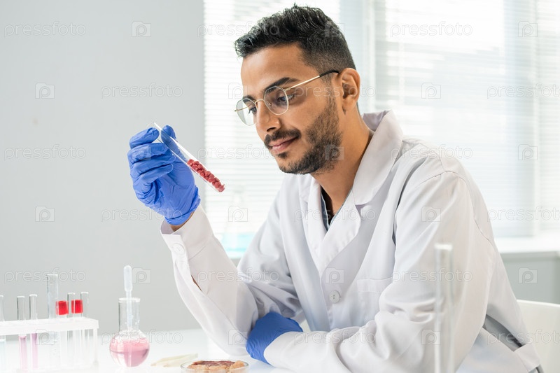 Исследователь в перчатках смотрит на колбу с несколькими крошечными образцами растительного мяса