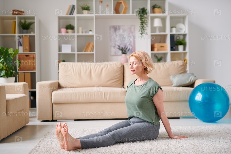 Зрелая блондинка активная женщина в спортивной одежде сидит на полу и занимается физическими упражнениями