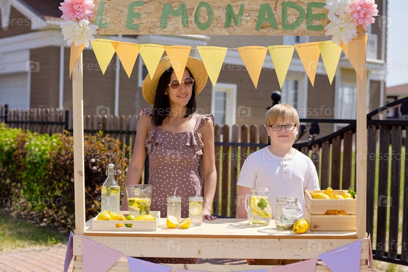 Молодая женщина в шляпе, платье и очках и ее маленький сын стоят у киоска