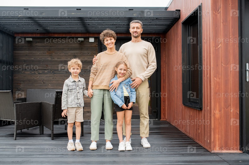 Счастливая семья молодых родителей и двух маленьких детей, стоящих на деревянном полу