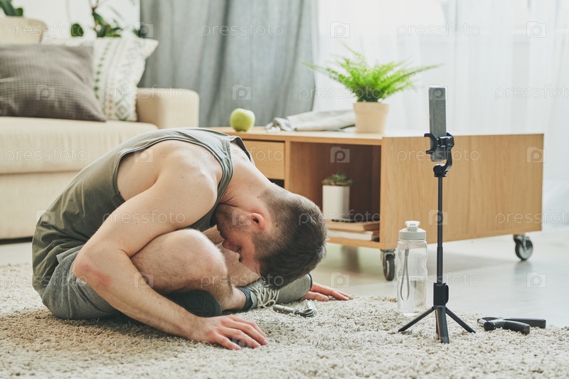Молодой активный мужчина со скрещенными ногами, склоняющийся вперед, сидя на полу