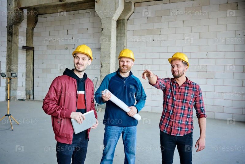 Счастливый молодой инженер в жесткой шляпе, указывающий на одну из стен незавершенного здания