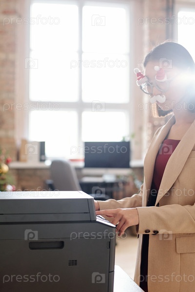 Молодая бизнесвумен в рождественских очках с усами нажимает кнопку старта