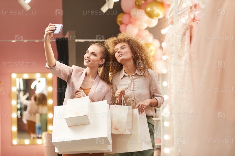 Две молодые женщины делают селфи в торговом центре