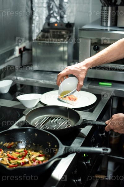 Рука молодого повара, заливающего оливковое масло в сковородку во время приготовления рыбы
