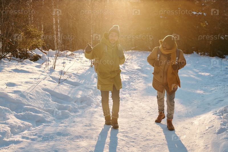 Два молодых межкультурных мужского рюкзака, взаимодействующих во время движения по дороге