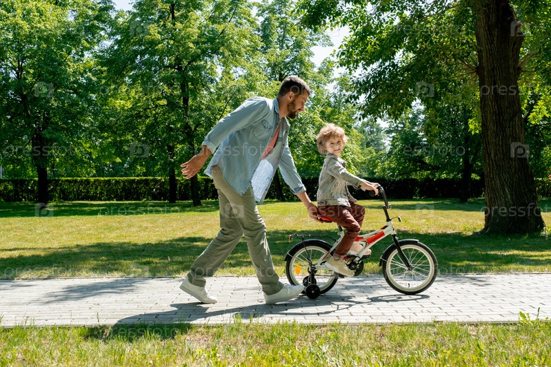 Молодой отец в повседневной одежде держит сиденье велосипеда своего очаровательного маленького сына
