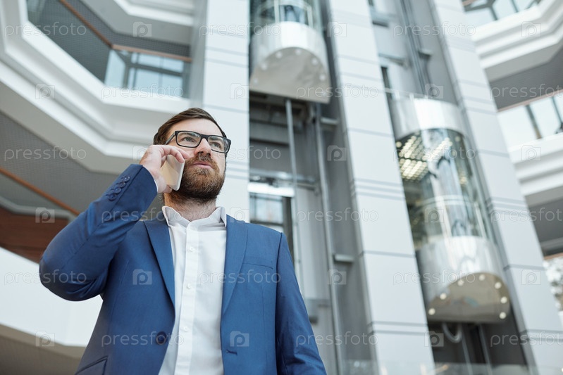 Молодой уверенный в себе бизнесмен со смартфоном по уху клиента-консультанта