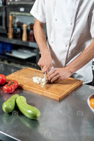 Руки молодого мужского повара, режущего свежий лук на деревянной доске у стола