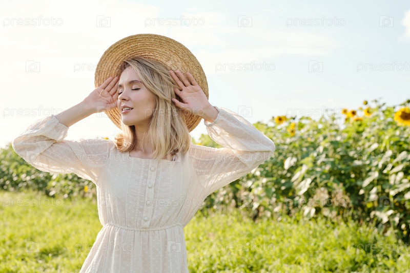 Красивая молодая блондинка в соломенной шляпе и белом платье с закрытыми глазами