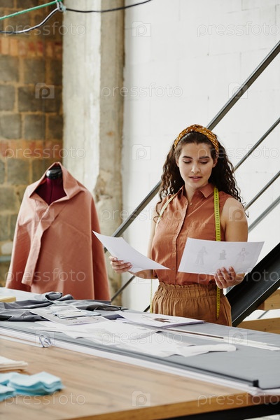 Молодая дизайнерка одежды смотрит на эскизы новых моделей