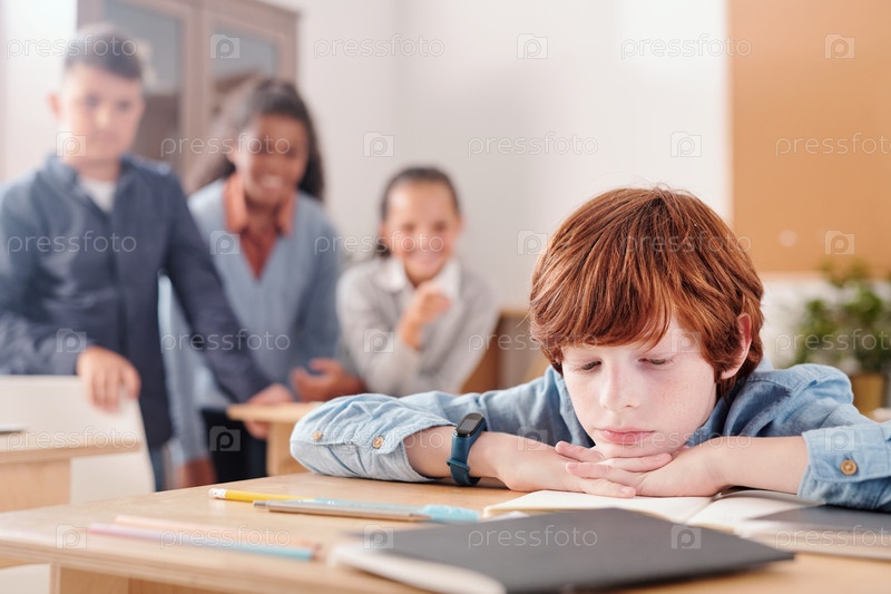 Скучный школьник держит подбородок и руки на копийке, читая заметки