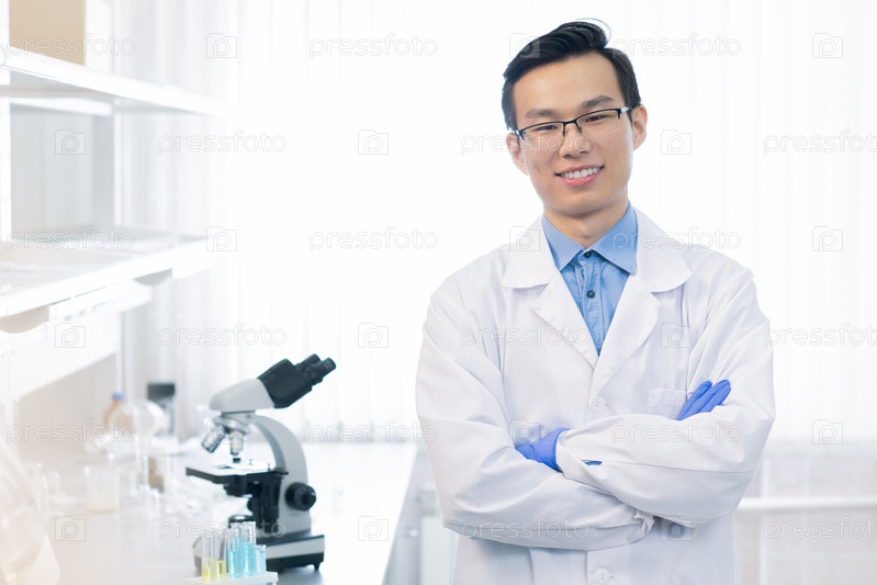Счастливый молодой китайский химик или исследователь со скрещенными руками у груди