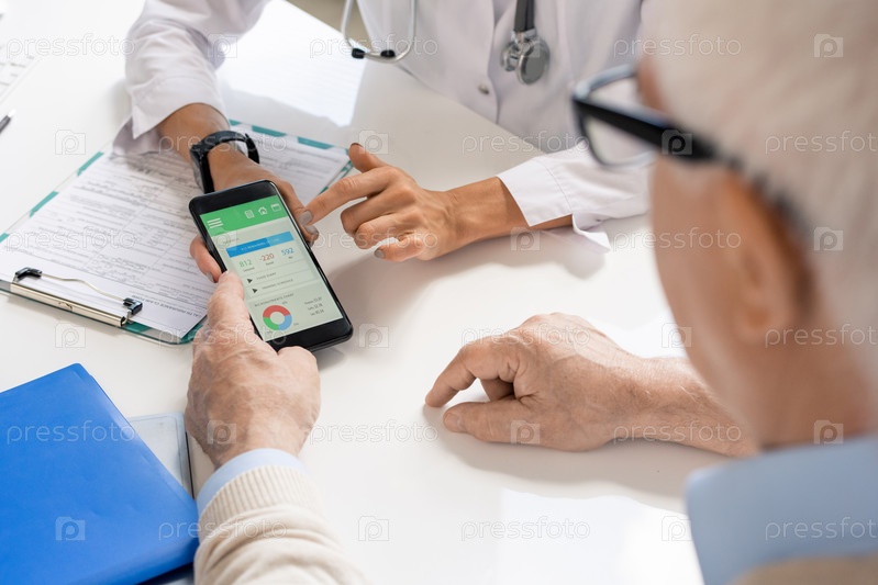 Руки молодой женщины-диетолога, показывающей своему старшему пациенту важные данные