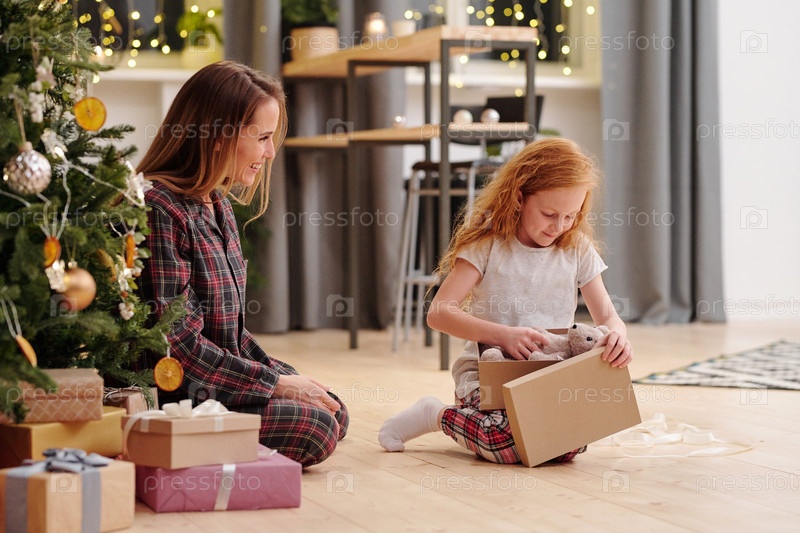 Милая девочка выносит плюшевого медведя из коробки с подарками, сидя на полу