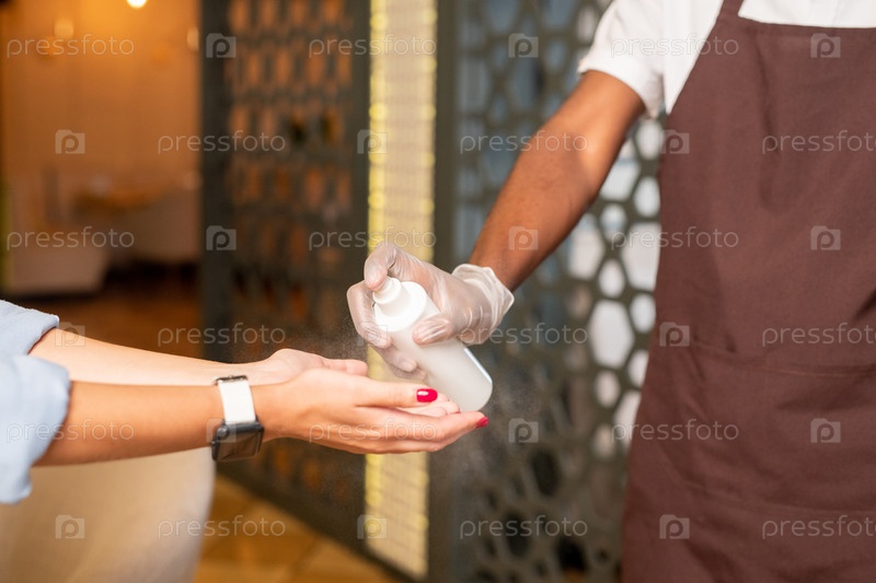 Официант с перчатками в коричневом фартуке разбрызгивает сантилайзер на руки клиентки