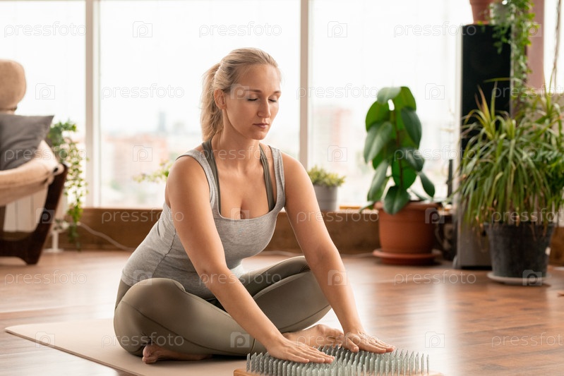 Современная молодая женщина, сидящая на коврике с ладонями на массажных подушках для йоги