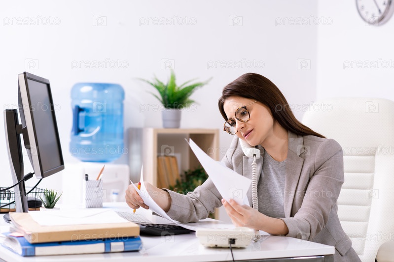 Загруженная секретарша усердно работает в офисе