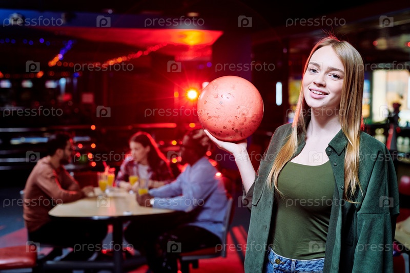 Счастливая молодая случайная женщина с длинными светлыми волосами, держащая мяч для боулинга