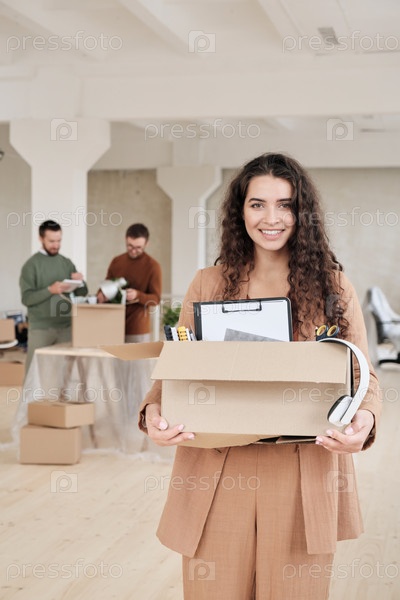 Портрет улыбающейся молодой деловой женщины с кудрявыми волосами в стильном костюме, держащей коробку со блокнотами, бумагами и наушниками во время переезда в новый офис