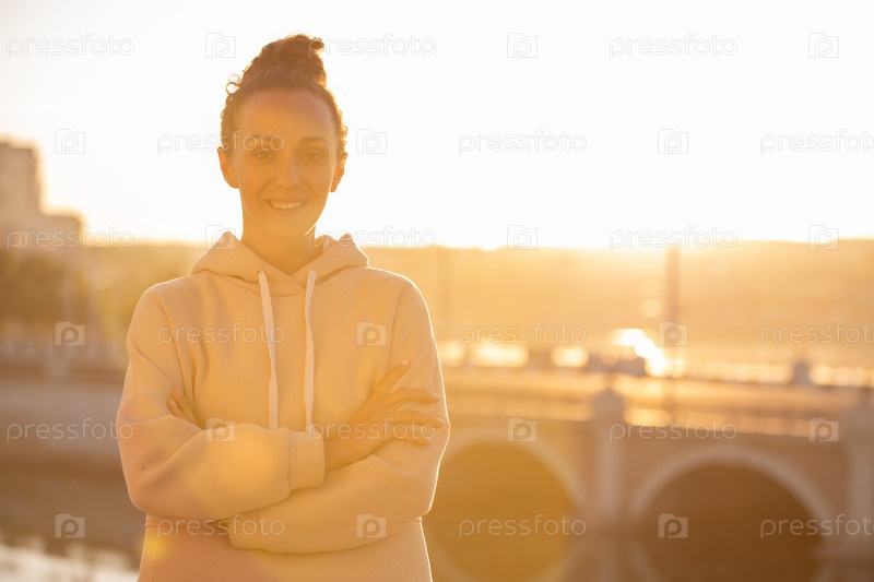 Молодая веселая спортсменка с зубчатой улыбкой, пересекая руки за грудь
